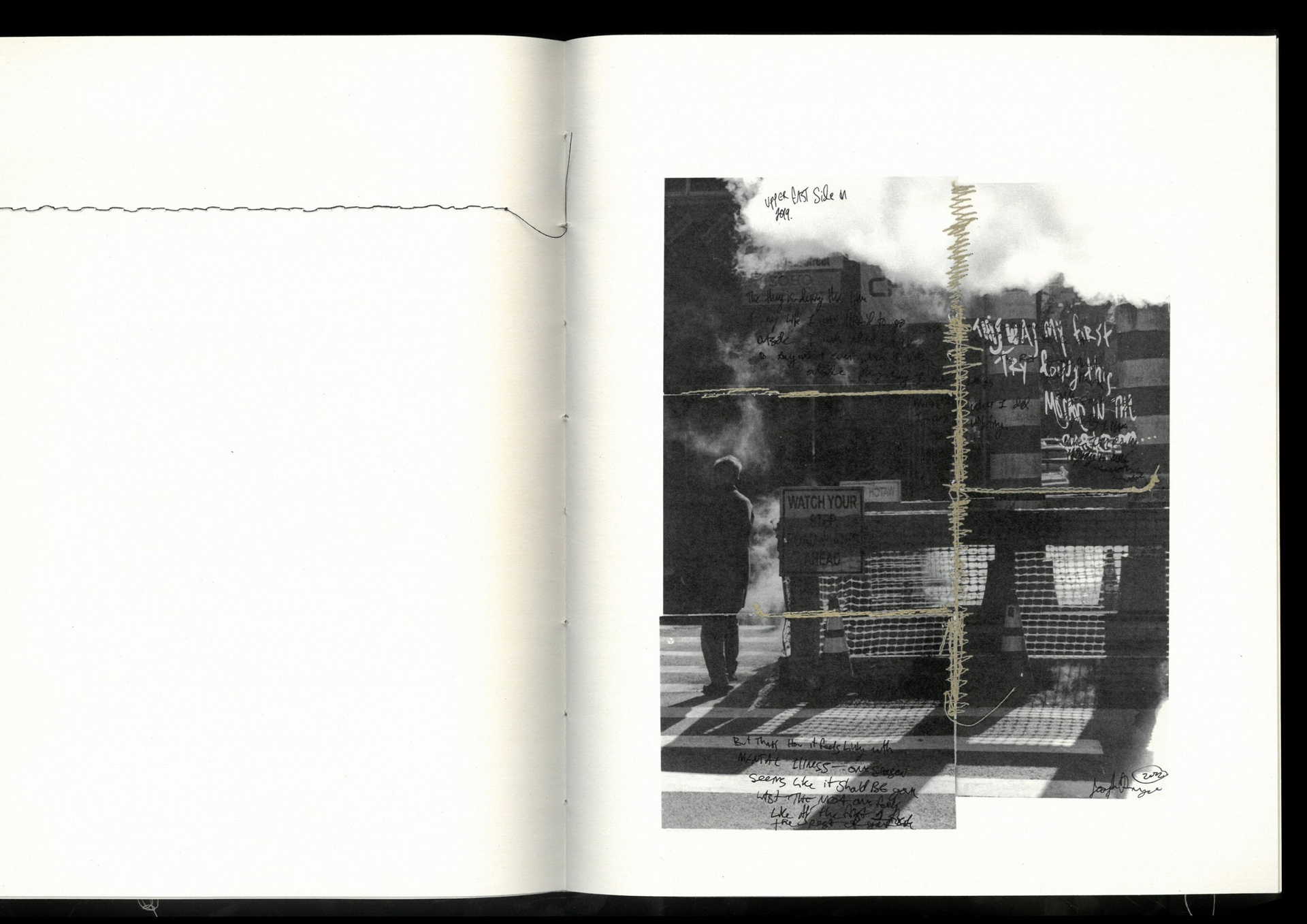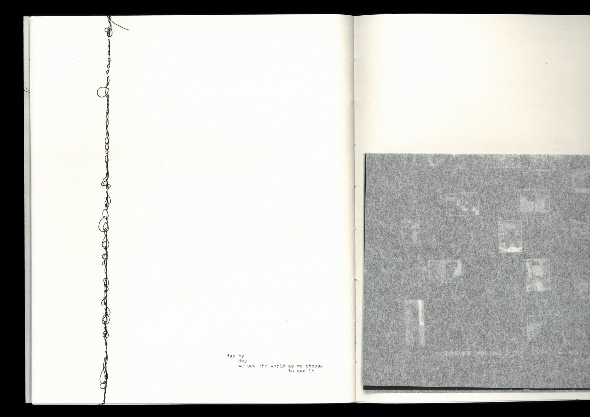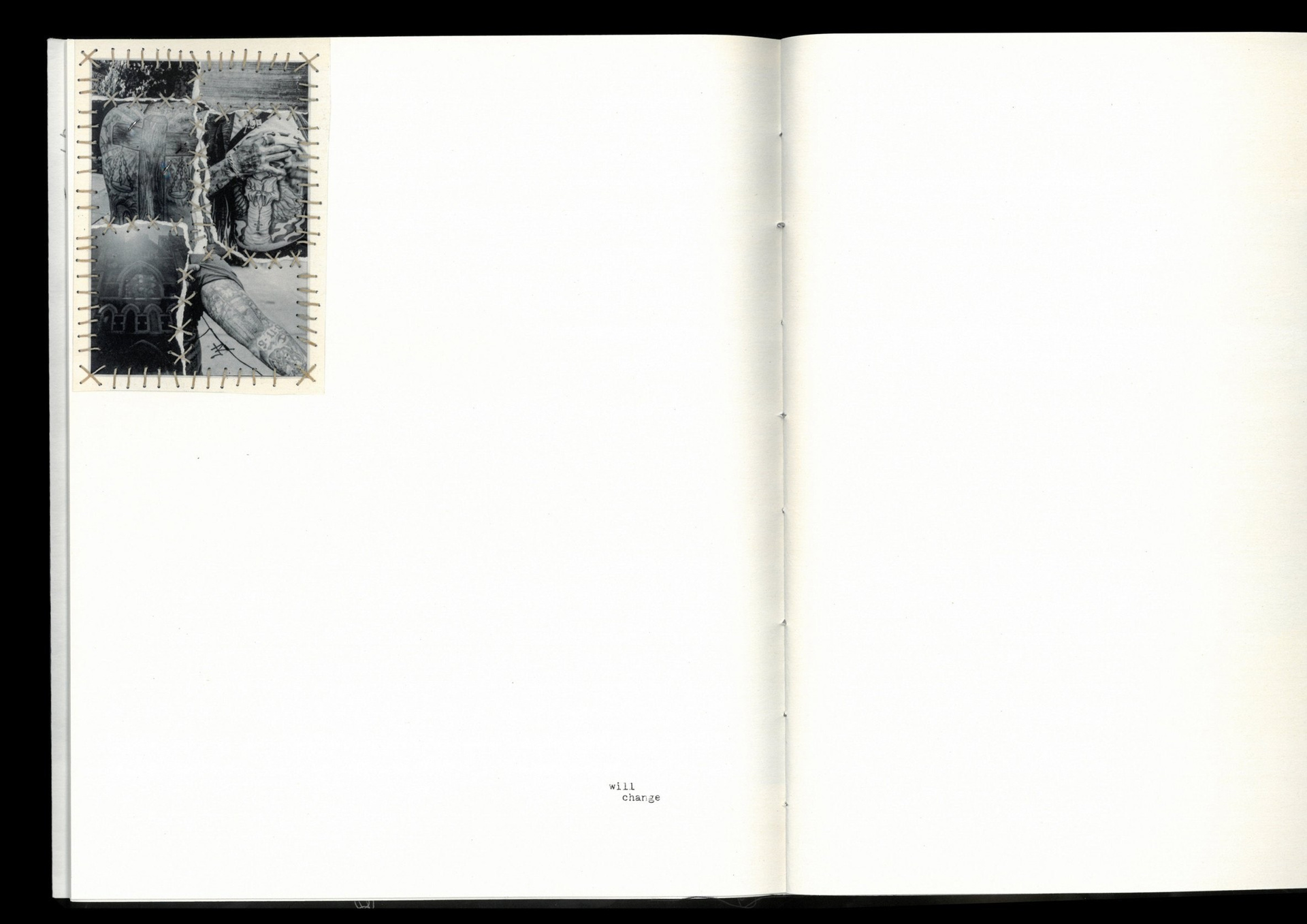 …разорванные и сшитые фотографии, «пустые» страницы, дневниковые подписи, хаотичность и акууратность (лучше сказать бережность), очень живая. Нити… швы? Сшивание разваливающегося мира?