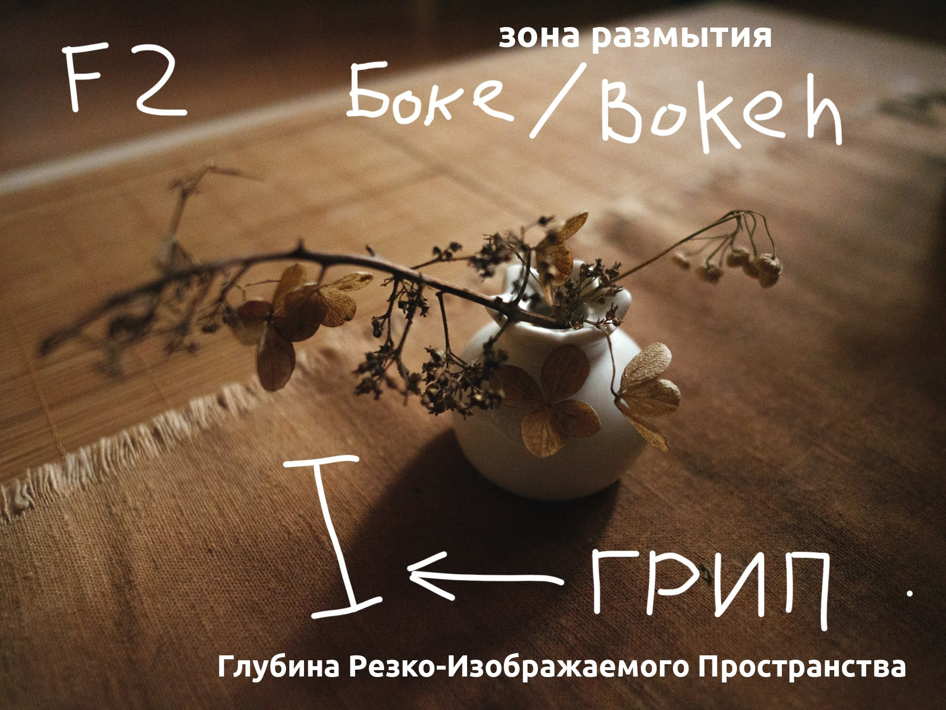 Частично закрывающийся механизм, который пропускает свет через объектив. Диафрагма (в народе «дырка») обозначается символом F. Например F2 или F5.6. На самом деле это дробь: